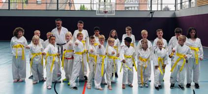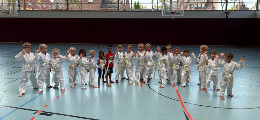 Die Prüfung zum 8. Kyu (Gelb Gurt) bestanden: Meriel Schröder, Jana Berghoff, Hannah Werneke, Emilia Beecht, Josephine Hoffmann, Max Müllmann, Henry Krieger, Lena Vogt, Felix Röser, Laurens Röser, Leon Rolfes, Nick Schröder, Laurenz Kolmes, Daniel Gergert, Maxim Gergert, Lina Brake, Juvan Kunnasseriyil, Jonatahn Sell, Sophie Siemens, Dayal Sobhy, Finn Rohde und Ben Stehler.