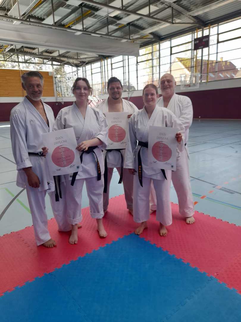 Beim Karate – Sommercamp auf Rügen bestanden Erik Boller den 1. Dan, Sammy Schmidt den 2. Dan, Bianca Schmidt den 3. Dan und Reinhard Schmidt den 7. Dan. Geprüft wurden die Kata (Kür), das Kihon (Grundtechniken) und die entsprechenden Spezialteile, Kata Bunkai (Kata Anwendung, Selbstverteidigung und Kumite (Kampf). Herzlichen Glückwunsch.
