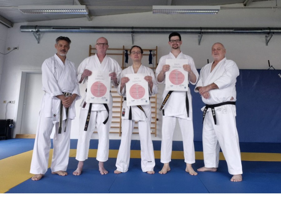 Kürzlich fanden in Bruchsal Dan-Prüfungen statt, aus unserem Dojo bestanden Michael Könning und Nikolai Taukchi die Prüfung zum 1. Dan. Thomas Radler bestand die Prüfung zum 2. Dan Prüfer waren Reinhard Schmidt (7. Dan) und Werner Dietrich (6. Dan), geprüft wurden die Kata (Kür), das Kihon (Grundtechniken) und die entsprechenden Spezialteile, Kata Bunkai (Kata Anwendung und Kumite (Kampf). Alle Prüflinge zeigten beachtliche Leistungen und nahmen anschließend zurecht die entsprechenden Auszeichnungen entgegen.
